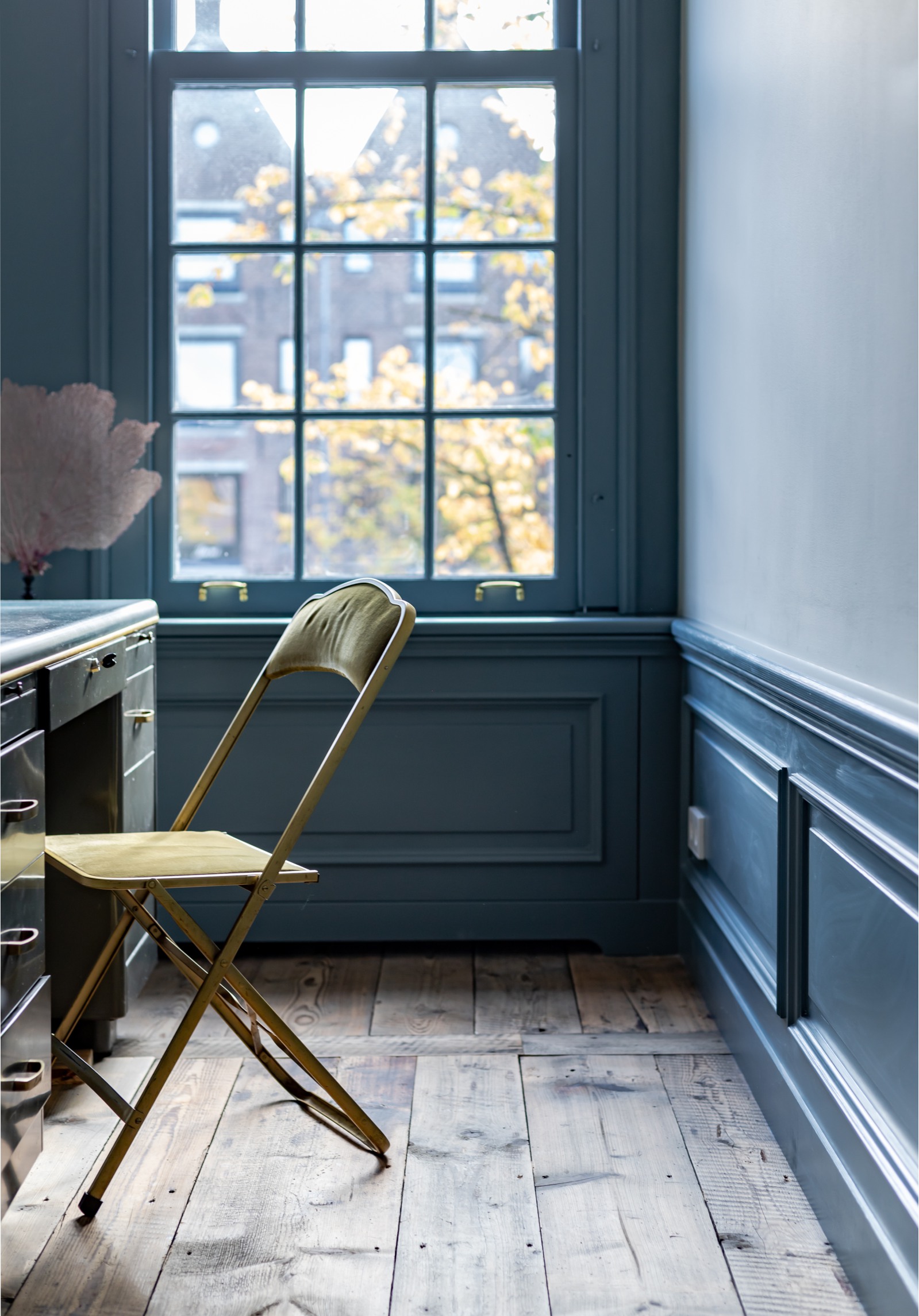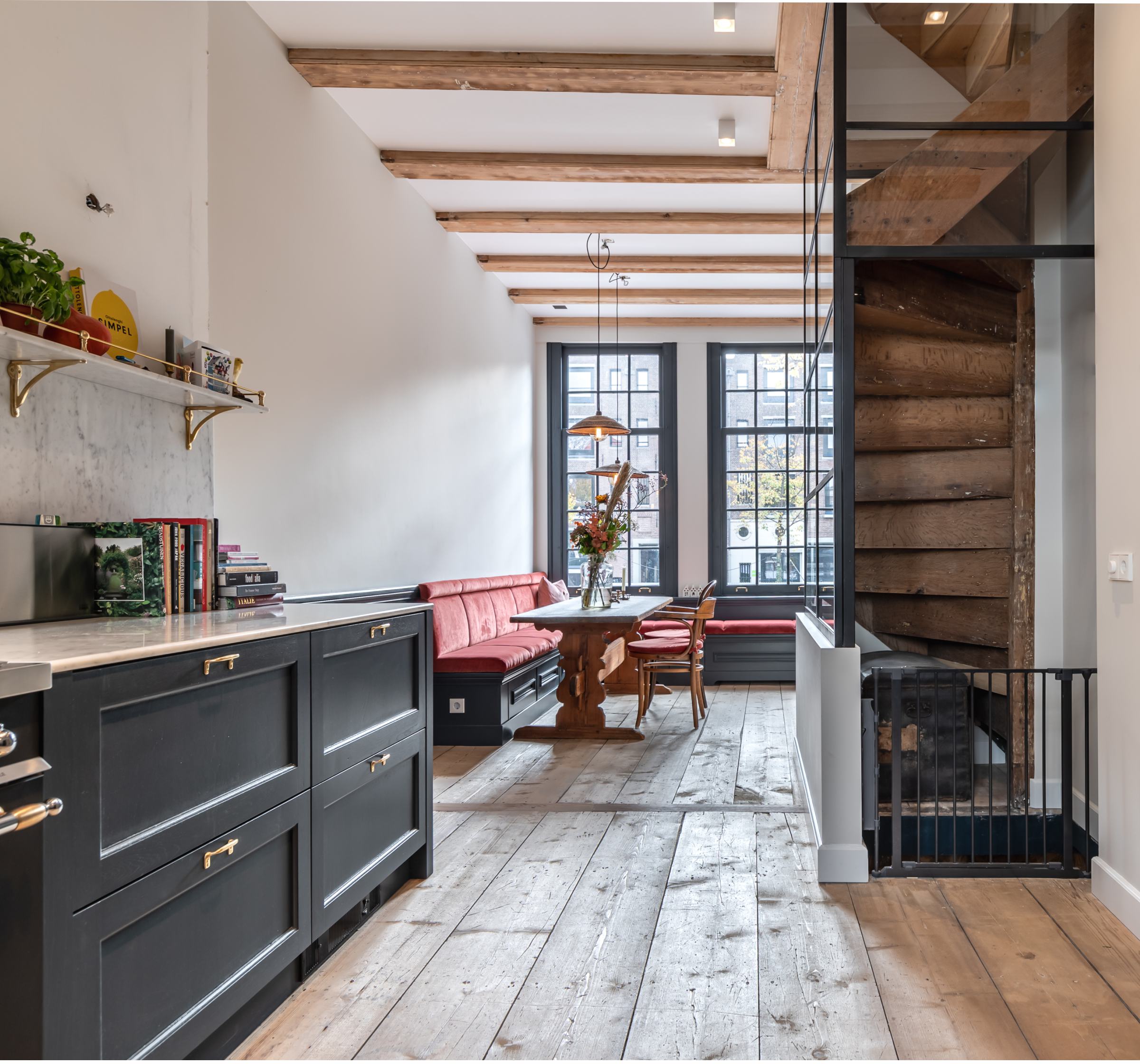 Omdat niets recht is, is bijna alles maatwerk. Kastenwanden, keukens en plinten moeten met de hand worden ingepast. De keuze voor materialen (messing, natuursteen, eiken) moet het karakter versterken, niet overschreeuwen.